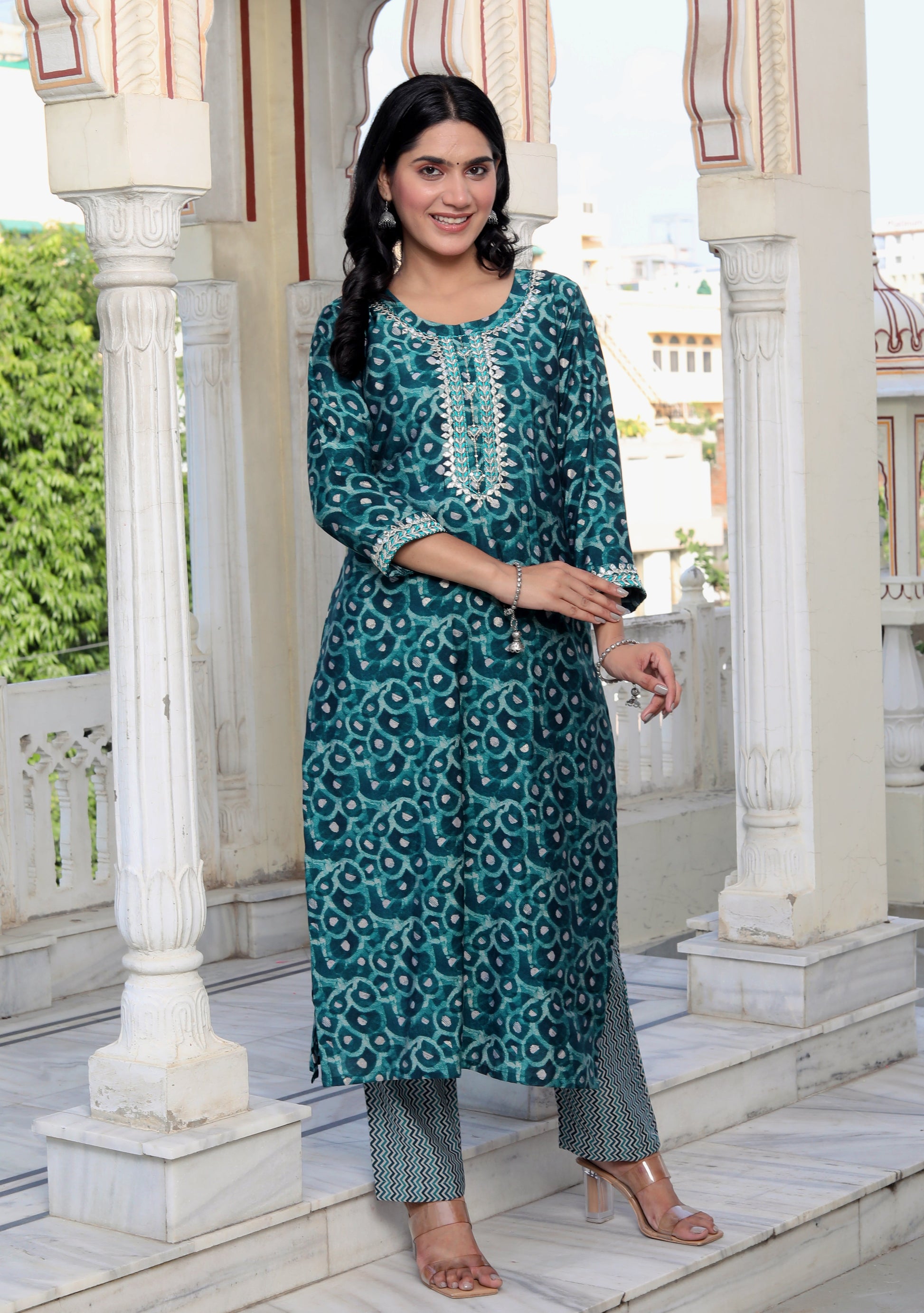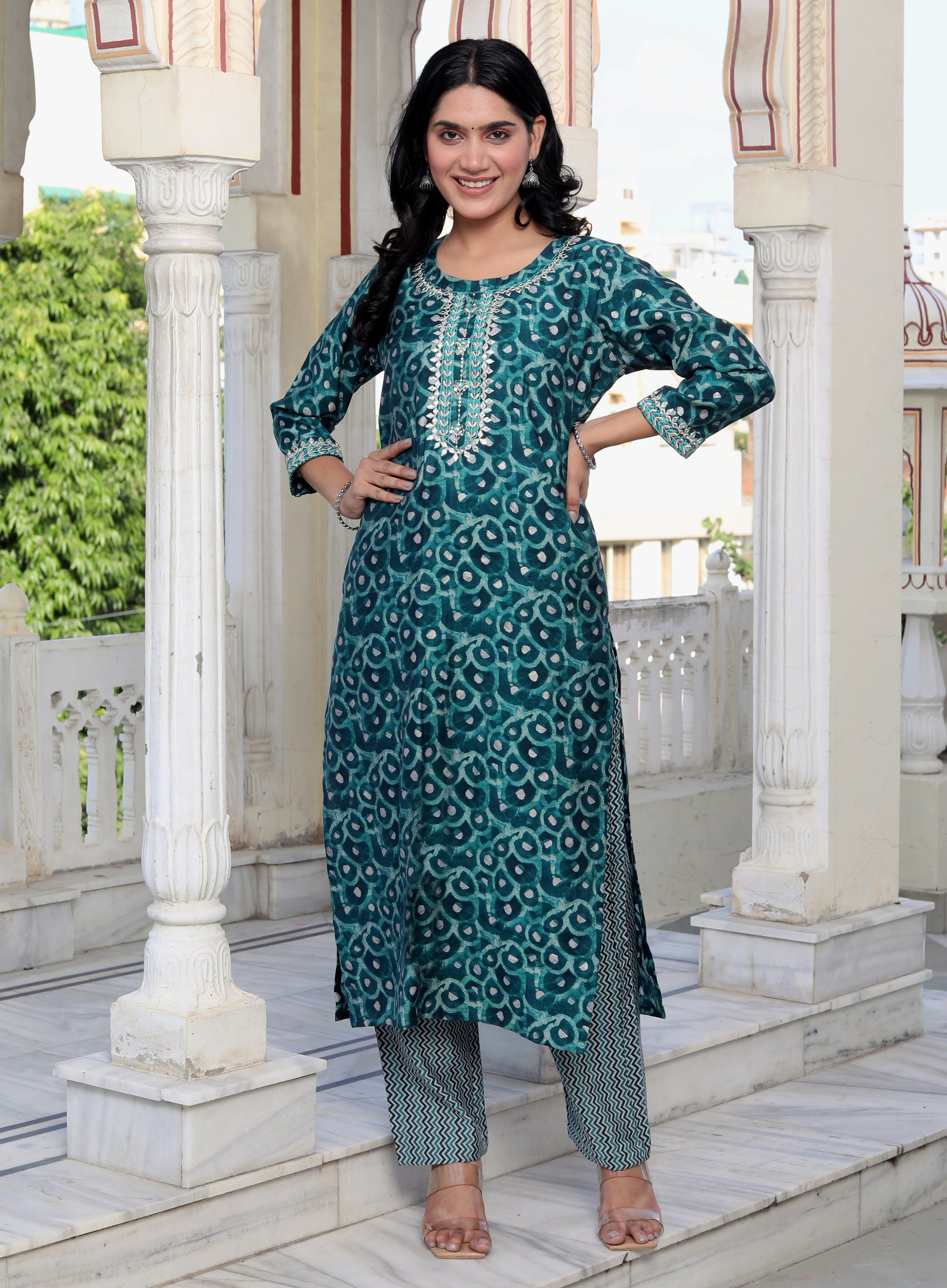 Green Muslin Printed Kurta Pant Set With Embroidery Work -900051
