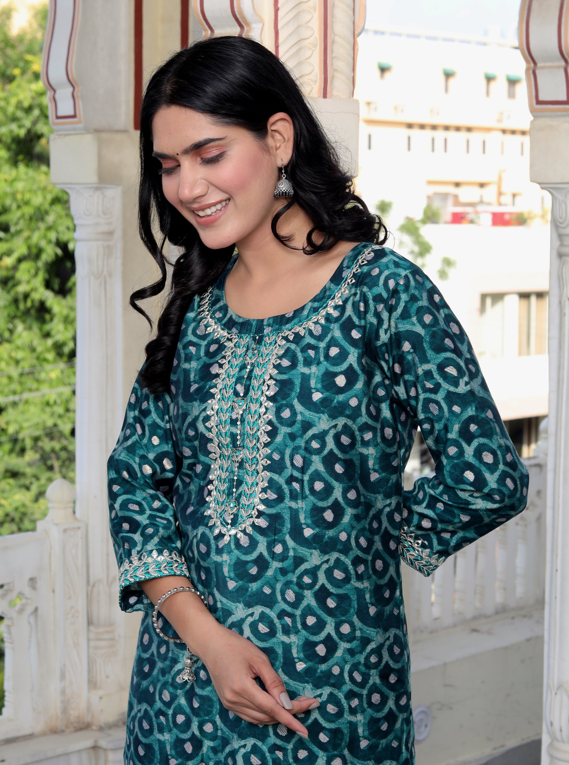 Step into a world of timeless elegance with this green muslin pant set, ideal for both casual wear and festive occasions. The rich green color combined with a delicate printed pattern creates a sophisticated yet relaxed look.